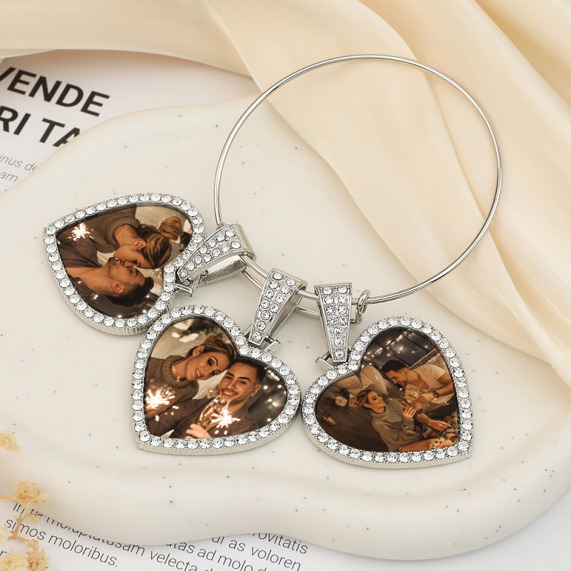 Hearts Photo Bangle Bracelet 3 Charms Custom Bracelet Gift For Her